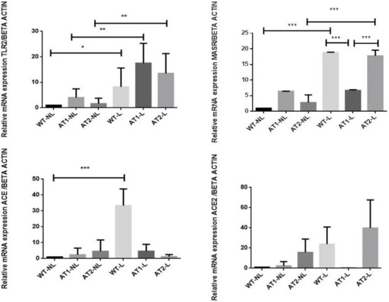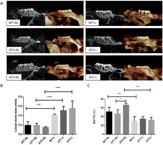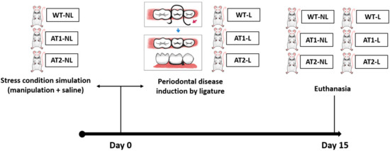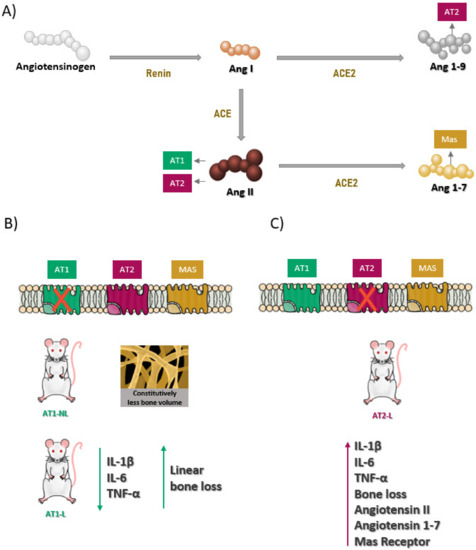 - Lima, M.; Medeiros, C.; Guerra, G.; Santos, R.; Bader, M.; Pirih, F.Q.; Araújo Júnior, R.F.; Chan, A.B.; Cruz, L.J.; Brito, G.; et al. AT1 and AT2 Receptor Knockout Changed Osteonectin and Bone Density in Mice in Periodontal Inflammation Experimental Model. Int. J. Mol. Sci. 2021, 22, 5217. [Google Scholar] [CrossRef]