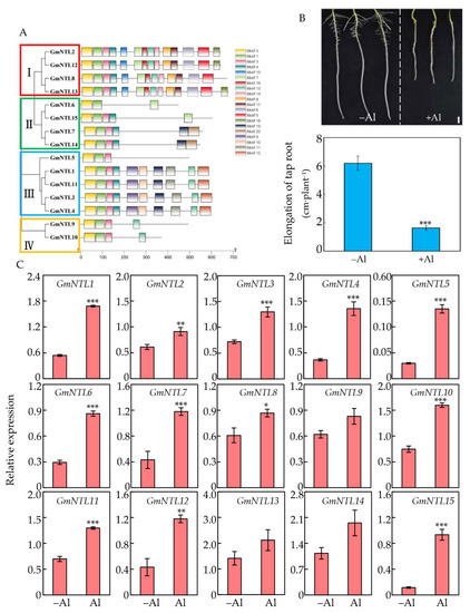 Expression of GmNTL members in response to Al toxicity. (A) Phylogenetic tree and conserved protein motifs in GmNTLs. The phylogenetic tree was constructed based on the amino acid sequences of GmNTLs using MEGA 7.0.14 software. The four clades were shown in different colors; (B) Phenotype and taproot elongation of soybean seedlings treated with (+Al) or without (−Al) 50 µM AlCl3 for 48 h; (C) Relative expression of GmNTLs in soybean roots tips (0–2 cm) in response to Al. Asterisks indicate significant differences between the +Al treatment and −Al control (*: 0.01 < p < 0.05; **: 0.001 < p < 0.01; ***: p < 0.001).