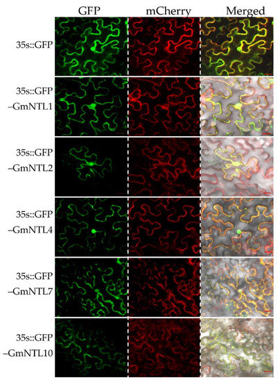 Subcellular localization analysis of GmNTLs in tobacco leaves. The green fluorescence derived from either 35S::GFP and 35S::GFP-GmNTLs, and the red fluorescence derived from 35S:AtPIP2A-mCherry were observed by the confocal microscope. Bar = 20 µm.