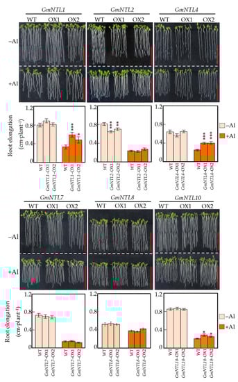 Six genes, including GmNTL1, GmNTL2, GmNTL4, GmNTL7, GmNTL8, and GmNTL10 from six duplicate gene pairs, were selected for functional characterization by overexpressing in Arabidopsis. It showed that though the expression of these GmNTLs were all up-regulated by Al in soybean root tips, not all of them were able to confer the Al tolerance in Arabidopsis. Among them, only overexpression of GmNTL1, GmNTL4, and GmNTL10 significantly increased the Arabidopsis root elongation in response to Al toxicity (Figure 3). The root elongation of two GmNTL4-overexpressing lines were about 1.54 and 1.60 folds (p < 0.001) higher than that of the wild type, respectively. While root elongation of the GmNTL1 and GmNTL10 overexpressing lines were about 1.46–1.78 and 1.20–1.36 fold higher than in the wild type, respectively (Figure 3).