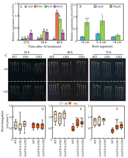 Functional characterization of GmNTL4. (A) Expression pattern of GmNTL4 in response to Al availability and treatment time. Lowercase letters represent significantly different groups in same treatment time; (B) Al-regulated expression pattern of GmNTL4 in different root segments. Asterisks indicate significant differences between 0 µM and 50 µM Al treatment in same root segments (*: p < 0.05 and *** p: < 0.001); (C) Phenotype of transgenic Arabidopsis with GmNTL4 overexpressing in response to Al toxicity. Bar = 0.5 cm; (D–F) Effects of GmNTL4 overexpression on the root elongation of Arabidopsis after 24 h (D), 48 h (E), and 72 h (F) of Al treatment. Asterisks indicate significant differences between WT and OX lines (***: p < 0.001).