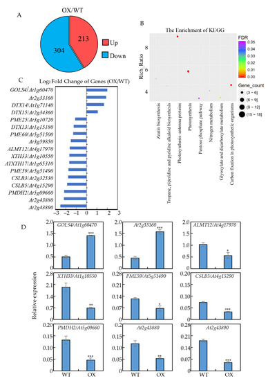 Gene expression profiles regulated by GmNTL4 in Arabidopsis. (A) Venn diagram showing the overlap of differentially regulated genes in GmNTL4-overexpressing plants compared to wild-type; (B) KEGG analysis of commonly regulated genes by GmNTL4 in response to Al; (C) List of partial GmNTL4-regulated genes in response to Al from RNA-seq; (D) qRT-PCR analysis of transcription accumulation of several genes in wild type and GmNTL4-overexpressing plants. Asterisks indicate significant differences between WT and OX (*: 0.01 < p < 0.05; **: 0.001 < p < 0.01; ***: p < 0.001).