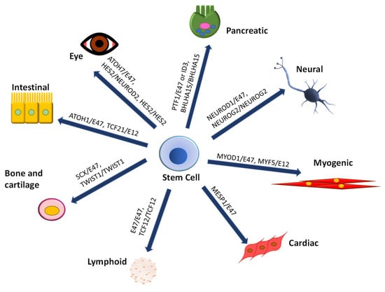 The bHLH family is one of the most prominent among transcription factors [,] and is involved in cell differentiation and tissue development [,] (Figure 1). Table S1 lists the developmental involvement of the TFs summarized in this review. These TFs share a characteristic protein structure composed of a basic region [] that interacts with DNA and a neighboring helix–loop–helix region that mediates dimerization []. Most bHLH dimers recognize the E-box, a hexameric sequence in the DNA with the consensus sequence CANNTG []. Nevertheless, further characterization and classification of the bHLH TFs groups revealed that some bHLH TFs could also recognize alternative sequences such as the N-box and the ESE-box [,]. These bHLH TFs modulate gene expression through dimer formation, combining activators or repressors with ubiquitous proteins (E-proteins) [,].