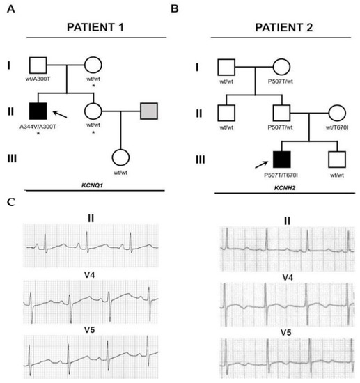 - Priori, S.G.; Schwartz, P.J.; Napolitano, C.; Bianchi, L.; Dennis, A.; De Fusco, M.; Brown, A.M.; Casari, G. A Recessive Variant of the Romano-Ward Long-QT Syndrome? Circulation 1998, 97, 2420–2425. [Google Scholar] [CrossRef] [PubMed]