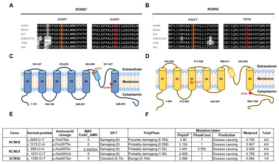 - Antúnez-Argüelles, E.; Rojo-Domínguez, A.; Arregui-Mena, A.L.; Jacobo-Albavera, L.; Márquez, M.; Iturralde-Torres, P.; Villarreal-Molina, M.T. Compound heterozygous KCNQ1 mutations (A300T/P535T) in a child with sudden unexplained death: Insights into possible molecular mechanisms based on protein modeling. Gene 2017, 627, 40–48. [Google Scholar] [CrossRef]