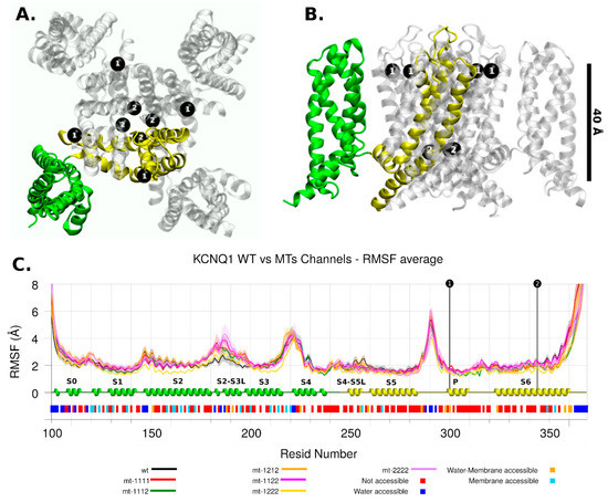 KCNQ1 Channel. The mutation location is shown with black dots and number 1 or 2. Two protein intermembrane domains are shown in green and yellow. (A) Top view. (B) Lateral view. (C) RMSF analysis for wild and mutant types. Each series corresponds to 4 chains and 4 replicas for each one, then it shows its average and standard deviation. The secondary structure motifs and solvent accessibility are shown below.
