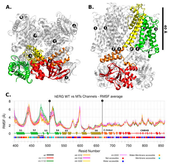 hERG Channel. The mutation location is shown with black dots and number 1 or 2. Four protein domains are shown in colors: intermembrane (green and yellow), inner side of the membrane (orange and red). (A) Top view. (B) Lateral view. (C) RMSF analysis for wild and mutant types. Each series corresponds to 4 chains and 4 replicas for each one, then it shows its average and standard deviation. The secondary structure motifs and solvent accessibility are shown below.
