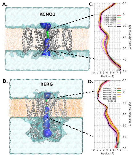 Each channel was placed in an explicit phospholipid membrane through the PPM method based on the OPM database [33]. For hERG channels, a bilayer of POPC (palmitoyloleoyl-phosphatidylcholine) (~270 lipids per leaflet) and for KCNQ1 channels a bilayer of POC and PIP2 (phosphatidyl-4,5-bisphosphate; 26 molecules at inner leaflet) was set up using the builder tool of the CHARMM-GUI website [34,35]. Although it is known that the main chains of these channels work together with other accessory proteins (KCNQ1/KCNE1 [36] and hERG/KCNE2 [11]), it is also known that the channels formed from the main chain maintain their function of transmitting current [11]. Due to the latter, and for the sake of simplicity, it was decided to work only with the main chain.