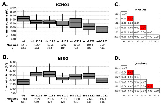 Channel volume. Box plots show the distribution of channel volume values calculated from molecular dynamics (A) KCNQ1 channel and (B). hERG channel. Panels (C). (KCNQ1) and (D). (hERG) show the Welsh t-test p-values between each data series. Boxes in red show nonsignificant differences between distributions. The time interval between each volume data is 0.5 nanoseconds.