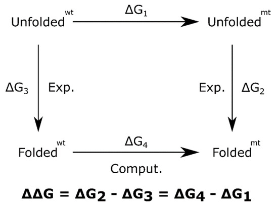 Technically, the change in stability of proteins is understood through a two-state folding model, where the change in the free energy of folding is assimilated as a change in its structure stability, due to the mutation. This change is calculated as ΔΔG = ΔGmtfolding − ΔGwtfolding, and negative values implies that mutation is destabilizing; otherwise, it induces stabilization. Computationally, the ΔΔG can be estimated as shown in Figure 7.
