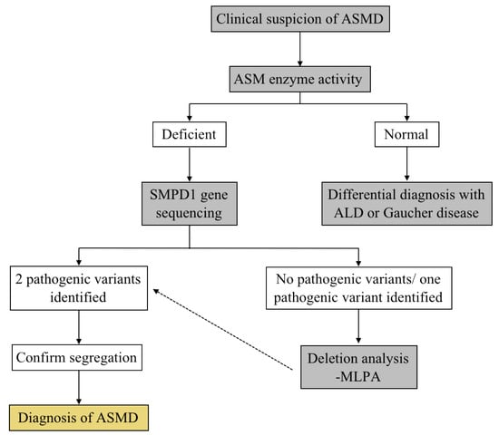 - McGovern, M.M.; Dionisi-Vici, C.; Giugliani, R.; Hwu, P.; Lidove, O.; Lukacs, Z.; Eugen Mengel, K.; Mistry, P.K.; Schuchman, E.H.; Wasserstein, M.P. Consensus recommendation for a diagnostic guideline for acid sphingomyelinase deficiency. Genet. Med. 2017, 19, 967–974. [Google Scholar] [CrossRef] [PubMed] [Green Version]