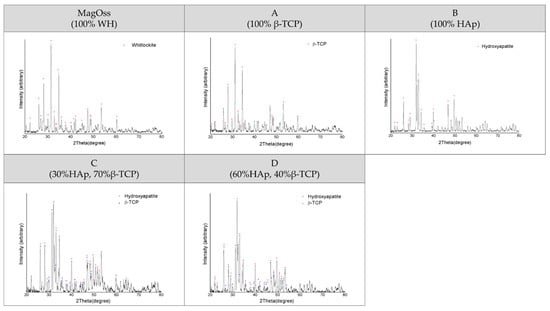 XRD patterns of different bone grafts. These observations were obtained by X-ray diffraction (XRD) analysis. A secondary phase was not found in any of the bone graft products. The XRD pattern of the MagOss group was broader than that of the others. Group (A) showed the β-TCP pattern, Group (B) showed the HAp pattern, Group (C) showed about 30% HAp and about 70% β-TCP, while Group (D) showed about 40% β-TCP and approximately 60% HAp. A secondary phase was not found. The pattern for Groups (A–D) had a sharper and narrower width than MagOss group.