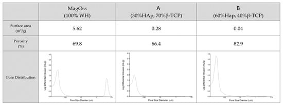 Surface area and pore size distributions of different bone grafts. The porosity of bone graft products was more than 60%, but nanopores (<500 nm) were only found in the MagOss group. The MagOss group exhibited the smallest grain size, which corresponds to a high surface area. The surface area was relatively low in Groups (A,B).