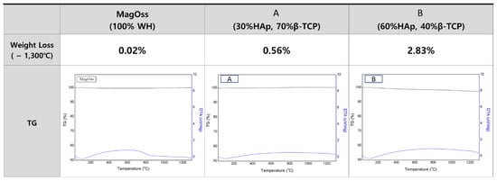 TG/DTA patterns of different bone grafts. The total weight loss of bone graft products as measured by thermogravimetric analysis to 1300 °C was found to be less than 5%. The total weight loss of the MagOss group was 0.02%, that of Group (A) was 0.56%, and that of Group (B) was 2.83%. It was confirmed that there was no degradation or phase translation to 1300 °C.