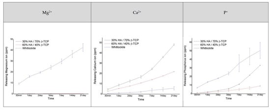 Measurements of the number of ions released from the bone graft products for 21 days confirmed that ions were most actively released from the MagOss group (Figure 5).