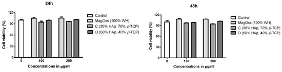 To evaluate the biocompatibility of the WH bone graft (MagOss), hASCs were cultured in eluted medium derived from each bone graft for 24 h, and cell viability was evaluated using a CCK-8 assay after 24 and 48 h of incubation. As shown in Figure 6, most hASCs showed normal morphology and size. In hASCs, over 90% cell viability (Figure 6) was observed in all bone grafts for 24 or 48 h, and the highest cell viability was observed in the MagOss grafts.
