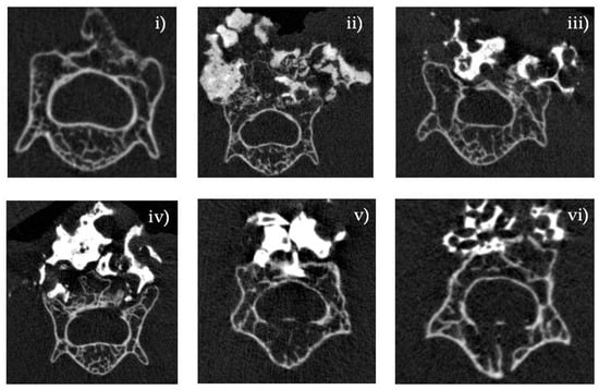 Mice were placed under anesthesia with a mixture of zoletil (50 mg/kg; Virbac Laboratories, Carros, France), Rompun (10 mg/kg; Bayer, Seoul, Korea), and saline solution injected intraperitoneally. The surgical site covered with hair and skin was shaved with a blade and disinfected with povidone-iodine and 70% ethanol. After a 15 mm incision of the skin and fascia was performed over the L4–L6 spinous processes, posterolateral lumbar spine fusion surgery was performed with a 1 mm pneumatic diamond burr from L4 to L6 to decorticate the articular processes until punctate bleeding was induced. The surgical procedures were performed by bilaterally revealing the articular processes of L4–L6. In each group, bone graft substitutes were implanted over the bilateral decorticated articular processes at each site. The fascia and skin were sutured with 4–0 black silk. Mice were cared for until full recovery on a heating pad following the surgical procedures. All mice were sacrificed by carbon dioxide inhalation 6 weeks after implantation, and their spines were resected for analysis.