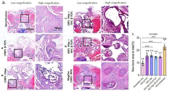 In the quantitative analysis of the new bone area to total bone area ratio using HE staining in the in vivo experimental groups (Figure 8), the MagOss group and Groups A, B, C, and D showed significant differences in the new bone area compared to the decortication group (mean ± SD: decortication group, 9.50% ± 1.34%; A, 15.08% ± 2.34%; B, 15.70% ± 1.19%; C, 14.76% ± 1.50%; D, 14.70% ± 0.95%; MagOss, 22.69% ± 2.67%; p < 0.0001). Among these alloplastic product groups, the MagOss group showed the highest new bone area.