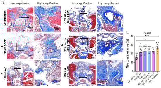 Histological analysis of bone regeneration in a spinal fusion model using Masson trichrome staining. (a) Images of cross-sections from each group (scale bar = 500 μm, 100 μm). (b) Quantitative measurements of new bone area to total bone area (* p < 0.05, *** p < 0.0001). Data were expressed as the mean ± SE (decortication, A, B, MagOss: n = 8/C, D: n = 5).