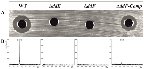To confirm our in silico analyses, we deleted genes encoding DdE or DdF and analyzed the resulting phenotype of the mutant strains. The deletion of each gene was performed by homologous recombination, using the thermosensitive vector pLT06 [37]. Of note, E. faecalis 14 ΔddE and ΔddF mutant strains were obtained, and their genetic backgrounds were confirmed by PCR and sequence analyses. Antibacterial assessment of cell-free supernatant (CFS) from ΔddE or ΔddF mutants was performed by the well-known agar diffusion test (ADT) against Listeria innocua ATCC33090 as the bacterial target. Importantly, no inhibitory activity was detected, arguing the absence of EntDD14 in the CFS of the mutant strains (Figure 2A). Therefore, each independently deleted gene entailed the total loss of antimicrobial activity. To confirm this hypothesis, MALDI-TOF/MS analysis was applied on CFS gathered from each mutant strain as well as from the wild type (WT). As expected, EntDD14 was not detected in the CFS from mutant strains (Figure 2B); conversely, that from the WT exhibited a typical peak of 5.2 kDa, corresponding to that of EntDD14, as previously reported by Caly et al. [18].