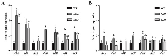 Relative expression values of ddABEFHIJ genes in ΔddE and ΔddF mutant strains compared to the WT strain at 5 h (A) and 24 h (B) of bacterial growth. The gyrase gene was used as an internal standard to normalize the values. Statistical significances are represented by letters a and b, which mean p < 0.05.