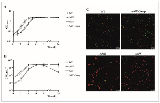 EntDD14 as above-stated accumulates inside the cell when DdE or DdF is missing. To verify the probable deleterious effect of this accumulation, we compared the kinetic growth of the mutants and complemented strains to that of the WT strain (Figure 5). These growth curves revealed discrepancies. The latency phase of the mutant strains is extended in the first hours of growth but reached the same OD600nm than that of the WT strain at the entrance of the stationary phase and remains constant throughout the 24 h of the experiment (Figure 5A). The growth rate (µ) of the mutant strain ΔddE was 1.06 ± 0.06 and that of ΔddF was 1.08 ± 0.07, and it does not differ from that of the WT strain, 1.16 ± 0.05. The complemented ΔddF-Comp strain shows the same behavior as the WT strain with a slightly lower growth rate, 1.01 ± 0.06, which can be ascribed to the presence of the pAT18:ddF plasmid. Overall, the mutant strains have registered a loss in cell viability (Figure 5B). The CFU counts indicate that all strains had reached approximately the same number of viable cells at the end of the exponential phase, ≈3 × 109 CFU·mL−1. However, after 24 h of growth, ΔddE and ΔddF mutant strains have registered 1 log reduction in CFU·mL−1 compared to the WT strain, which represents a 90% loss of cell viability. The loss of cell viability is not necessarily correlated to loss of turbidity of the bacterial culture, as cell lysis seems not to occur.