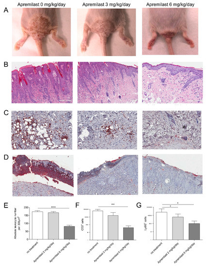 Five mice with psoriatic lesions were administered apremilast at 2 mg/kg/day, five mice received 6 mg/kg/day and five mice were left untreated as positive controls. Five mice without prior tape-stripping and consecutive development of psoriatic lesions served as negative control mice. Treatment with apremilast at 2 mg/kg/day and 6 mg/kg/day resulted in moderate and significant resolution of inflamed plaques after 2 weeks of treatment, respectively (Figure 1A). Histological examination of psoriatic lesions revealed dramatically decreased epidermal thickening and a reduced leukocytic dermal infiltrate in mice treated with the higher dose of apremilast, whereas a minimal effect was seen in the skin of mice treated with 2 mg/kg/day (Figure 1B,E). Immunohistochemical analysis revealed a reduced infiltration of CD3+ lymphocytes and Ly6G+ neutrophils upon treatment with apremilast at 2 mg/kg/day, which was more pronounced with 6 mg/kg/day (Figure 1C,D,F,G).