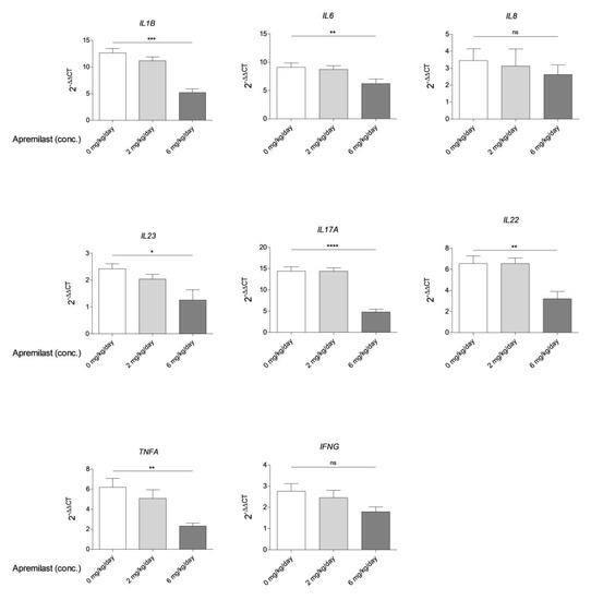 Quantitative PCR was performed on lesional skin samples of heterozygous K5.Stat3C mice either left untreated or treated with 2 mg/kg/day or 6 mg/kg/day apremilast for two weeks. qPCR was performed with primers for the indicated murine cytokines. Non-lesional skin from K5.Stat3C mice served as an internal control (2−ᴧᴧCT = 1). Shown is the mean ± SEM of 5 mice/condition. Statistical analysis was performed using One-way Anova followed by Tukey’s posthoc test. ****: p < 0.0001, ***: p < 0.001, **: p < 0.01, *: p < 0.05, ns: p ≥ 0.05.