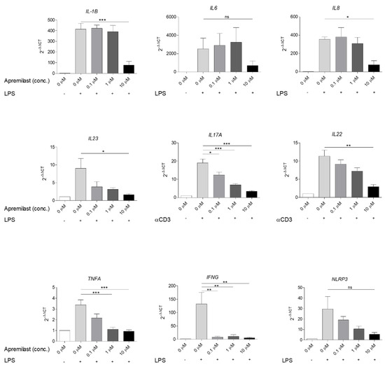 To assess the effect of apremilast on the response of human immune cells, we stimulated peripheral mononuclear cells (PBMCs) with 100 ng/mL ultra-pure lipopolysaccharide (upLPS) or anti-CD3 overnight to induce the expression of pro-inflammatory cytokines including IL1B, IL6, and chemokine IL8, as well as IL23, IL17A, IL22, TNFA and IFNG. In PBMCs, apremilast at a concentration of 10 µM significantly inhibited the expression of IL1B, IL8, IL23, IL17A, IL22, TNFA and IFNG after stimulation with upLPS (IL1B, IL8, IL23, TNFA and IFNG) or anti-CD3 (IL17A, IL22). IL6 and NLRP3 showed a clear trend of decreased expression, however, this was not statistically significant. Moreover, IL17A, TNFA and IFNG expression was also significantly decreased at concentrations of 0.1 µM and 1 µM apremilast. The other cytokines showed only a trend towards a decrease in expression at apremilast concentrations of 0.1 µM and 1 µM (Figure 3).