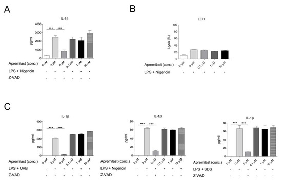 PBMCs and keratinocytes were incubated at 37 °C in a humidified atmosphere of 5% CO2 for 2 and 24 h, respectively. PBMCs were then primed with upLPS (100 ng/mL) for 16 h. Apremilast or 1 µM Z-VAD (Selleck Chemicals, Houston, TX, USA) treatment was applied for 1 h before stimulation with 1 µM nigericin (Selleck Chemicals, Houston, TX, USA) for PBMCs or with 86.4 mJ/cm2 UVB (UV802L; Waldmann, Villingen-Schwenningen, Germany), nigericin [39] or SDS (15 µg/mL) for keratinocytes. After 6 h of incubation at 37 °C, the supernatant was collected.