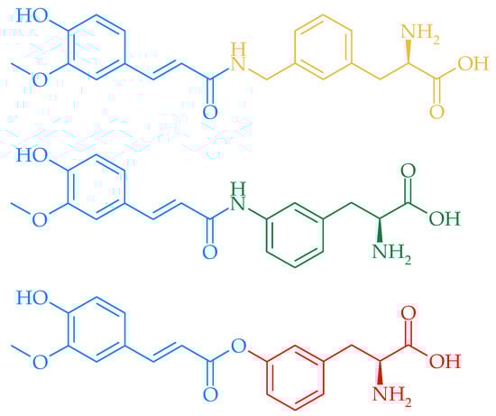 A new amino acid–based prodrug for simultaneous intestinal release of silybin and ferulic acid was developed by the team of Trombino et al. [111]. The carrier for the synthesized l-phenylalanine-N-(4-hydroxy-3-methoxyphenyl) prop-2-en-O-(2R,3R)-3,5,7-trihydroxy-2-((2R,3R)-3-(4-hydroxy-3-methoxyphenyl)-2-(hydroxymethyl)-2,3-dihydro-benzo-(1,4)-dioxin-6-yl)croman-4-one was 1-phenylalanine, which has an intrinsic chemical reactivity due to the presence of an amine group, placed on the chiral center, and a carboxylic group. Ferulic acid is attached to the amine group of the amino acid by the amide bond (Figure 4). The obtained prodrug demonstrated high antioxidant activity under simulated physiological conditions; therefore, this method might be used for improving therapeutic potential of other highly reactive and poorly water-soluble biological substances.