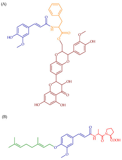 Chemical structures of (A) 1-phenylalanine-N-(4-hydroxy-3-methoxyphenyl) prop-2-en-O-(2R,3R)-3,5,7-trihydroxy-2-((2R,3R)-3-(4-hydroxy-3-methoxyphenyl)-2-(hydroxymethyl)-2,3-dihydro-benzo-(1,4)-dioxin-6-yl)croman-4-one and (B) 3-(4′geranyloxy-3′-methoxyphenyl)-2-trans-propenoyl-L-alanyl-L-proline.