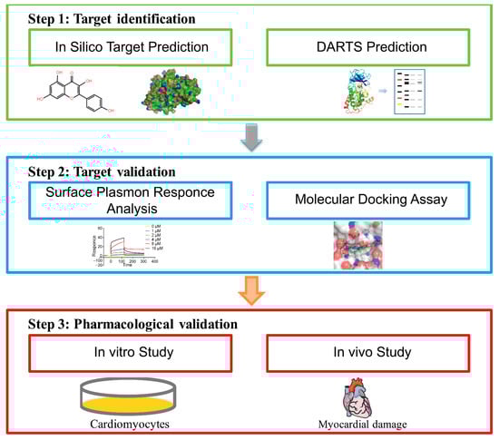 In this study, we proposed a novel strategy that combined the in silico target identification and DARTS prediction method to identify the direct target of Kae. Then, compound-receptor interactions were further confirmed by molecular docking and surface plasmon resonance (SPR) analysis. Furthermore, the cardioprotective effects against myocardial infarction were analyzed (Figure 1). This initial phase of target identification can be done rapidly by integrated approaches to identify the optimal lead from different structural isomers. This novel methodology may help uncover new therapeutic targets and molecular pathways for myocardial infarction therapy. In addition, this knowledge could shed light on identifying new therapeutic targets and molecular pathways for currently untreatable diseases.