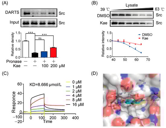 Identification and validation of Src as a direct target for Kae. (A) Immunoblot analysis of Src treated with DARTS assay (n = 3). (B) Immunoblot analysis of Src degradation insult by indicated temperature (n = 3). (C) Surface plasmon resonance (SPR) analysis of the interaction between Kae and Src: KD = 8.666 μmol/L (n = 3). (D) Predicted binding mode of Kae in the ATP-site of the Src catalytic domain. Protein is shown in surface, and key amino acids interacting with Kae are highlighted in stick representation. Kae is colored in cyan. Hydrogen bonds are depicted by blue dashed lines. *** p < 0.001 and ns, statistically not significant.