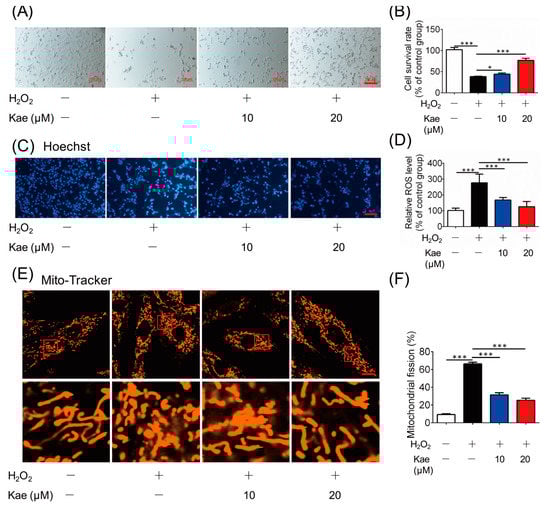 To further verify the protective effects of Kae, we applied cardiac myoblast H9C2 cells for in vitro assays. H9C2 cells were maintained in medium supplied with different concentrations of Kae (10 and 20 μM). The results showed that the survival rate was increased with the addition of Kae, indicating that Kae protected cell survival against H2O2 insult (Figure 4A,B). Hoechst 33342 is an apoptotizing cell detection fluorescent probe that brightly stains chromatin in cell nuclei [23]. Apoptotizing cells exhibit apoptosis-related alterations in the chromatin state. In the H2O2 treated group, the nucleus showed extremely bright zones, which suggested abnormalities in the nucleus size or shape, and heterogeneous staining of chromatin. However, the cells treated with Kae were homogenously stained with Hoechst 33342, indicating that the addition of Kae protected the nucleus from oxidative damage (Figure 4C). Oxidative stress is a significant characteristic in myocardial infarction, and Kae treatment effectively suppressed H2O2-induced ROS generation (Figure 4D). In addition, the ROS level was detected, and the ROS level was reversed by the treatment of Kae, suggesting that Kae prevented mitochondrial fragmentation through the inhibition of oxidative stress (Figure 3E,F). In conclusion, these results indicate that Kae could protect against and prevent cell apoptosis via mitochondria protection.