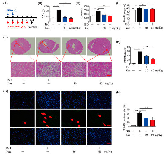 Kae protects the heart from ISO-induced myocardial damage in rats. (A) The myocardial damage in rats was established with isoprenaline (ISO) for 2 days, and Kae was orally administrated (30, 60 mg/kg, 5d). (B) The level of CK in the blood (n = 6). (C) The leakage of LDH in the blood (n = 6). (D) The ratio of heart weight to tibia length (HW/TL) (n = 6). (E) Representative HE-stained heart sections, the lower panel are enlarged from the red boxex in the upper panel (n = 6, scale bar, 50 µm). (F) Quantitative analysis of infarct size. (G) Apoptosis detection using TUNEL staining assay (scale bar, 50 µm). The red arrows indicate TUNEL positive cells. (H) Quantification of TUNEL positive cells (n = 6). * p < 0.05, ** p < 0.01, *** p < 0.001 and ns, statistically not significant.