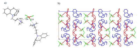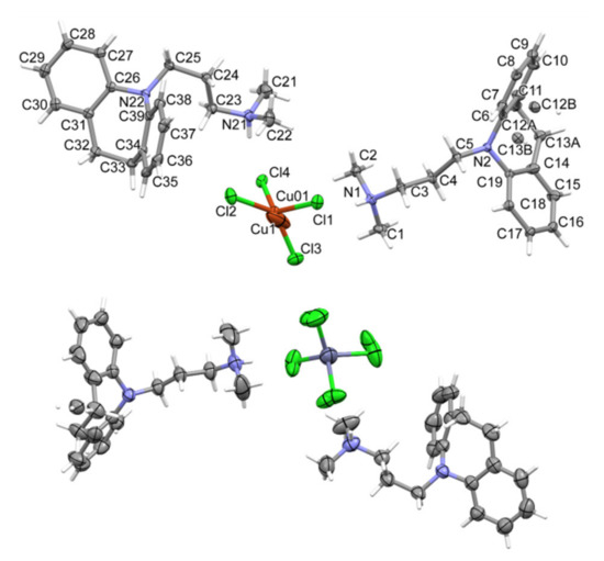 Unit cell parameters indicate that the structures are isostructural (the parameter indicating the similarity of cells is Π = 0.0186 [20]). The copper-containing salt exhibits a disorder at one imipramine molecule and at the copper position. However, in the case of a zinc compound, which was measured at 294 K, there is an identical disorder on the imipramine molecule and additionally on the entire anion (ZnCl42−). Both structures have analogous N-H... Cl hydrogen bonds stabilizing the cation–MCl4–cation fragment (Tables S1 and S2 and Figure 2).