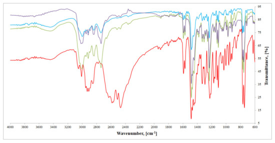 FTIR spectra of investigated compounds: [HL]2+[CuCl4]2− (blue), [HL]2+[ZnCl4]2− (green), [HL]2+[CdCl4]2− (purple), and imipramine hydrochloride (red).
