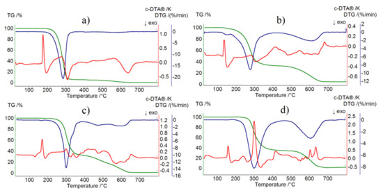 Imipramine hydrochloride itself is stable at up to 175 °C (Figure 5a). At this temperature, it melts; the melting point was determined to be 173.7–174.9 °C, which corresponds very well with the endothermic DTA peak at 175 °C that can be ascribed to this phase change. In the temperature range of 175–340 °C, we observe one major mass loss (95%) (DTG peak at 285 ℃), which is a result of thermal destruction of the compound. Next, from 400 °C up to 660 °C, we observe small mass loss (5%), which can be probably ascribed to post-combustion processes of the organic molecule.
