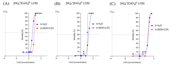 The lethal concentrations (LC50) (log[concentration]) detected for [HL]2+[CuCl4]2− (A), [HL]2+[ZnCl4]2− (B), and [HL]2+[CdCl4]2− (C) in a solvent-dependent manner of changes (water, H2O/ethanol, EtOH 0.2%).
