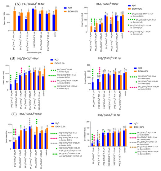 2.6.2. Determination of the Heart Rate of Zebrafish Larvae in 0–5 dpf. The Solvent-Dependent Effect of [HL]2+[CuCl4]2− (A), [HL]2+[ZnCl4]2− (B), and [HL]2+[CdCl4]2− (C) on the Heart Rate of Zebrafish Larvae in 48 hpf (Left) and 96 hpf (Right)