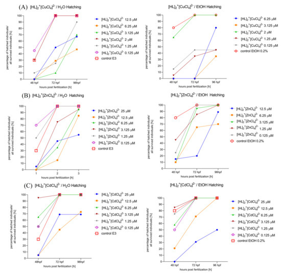 Solvent-dependent effect (ethanol (left)/water (right)) effect of [HL]2+[CuCl4]2− (A), [HL]2+[ZnCl4]2− (B), and [HL]2+[CdCl4]2− (C) on the hatching rate after 48 hpf, 72 hpf, and 96 hpf of Zebrafish larvae.