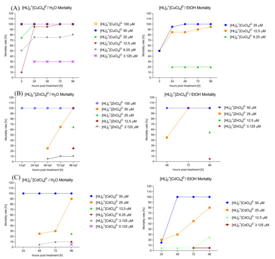The [HL]2+[CuCl4]2− (A), [HL]2+[ZnCl4]2− (B), and [HL]2+[CdCl4]2− (C) influence on the solvent-dependent (H2O (left); EtOH 0.2% (right)) Zebrafish larvae’s mortality rate.
