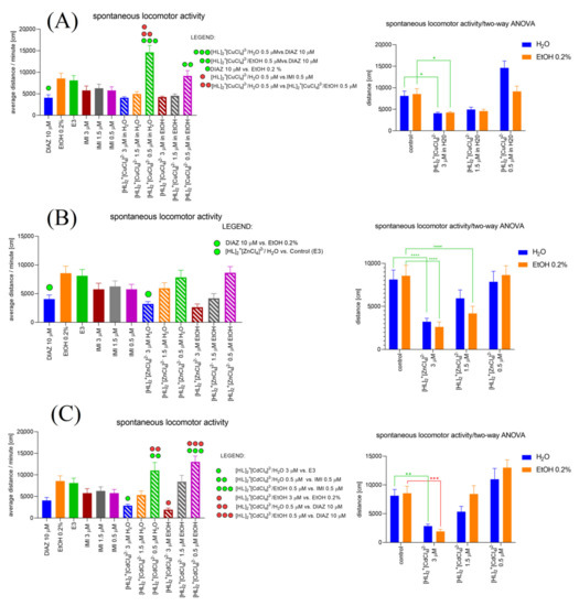 One-way ANOVA analysis (Figure 11A) revealed a significant difference in the spontaneous locomotor activity (average distance/minute (cm)) caused by treatment (F (11, 276) = 10.69, p < 0.0001). Tukey’s post hoc test revealed significant increase in the average distance/minute (cm) after [HL]2+[CuCl4]2−/H2O 0.5 µM (p < 0.0001) and [HL]2+[CuCl4]2−/EtOH 0.5 µM (p < 0.01) treatment when compared with DIAZ 10 µM. Moreover, Tukey’s post hoc test showed significant increase in the average distance/minute (cm) after [HL]2+[CuCl4]2−/H2O 0.5 µM when compared with IMI 0.5 µM (p < 0.0001). When the treatment with [HL]2+[CuCl4]2−/H2O 0.5 µM was applied the average distance/minute (cm) was significantly increased when compared with [HL]2+[CuCl4]2−/EtOH 0.5 µM (p < 0.01). Two-way ANOVA analysis revealed significant difference in spontaneous locomotor activity (average distance/minute (cm)) in a treatment (F (2.064, 47.47) = 21.38, p < 0.0001), used solvent (F (1, 23) = 4.764, p = 0.0395), and solvent–treatment interaction (F (1.409, 32.40) = 8.278, p = 0.0033). Bonferroni’s post hoc test revealed a significant decrease in the spontaneous locomotor activity after [HL]2+[CuCl4]2−/H2O 3 µM and [HL]2+[CuCl4]2−/EtOH 3 µM treatment when compared to the control groups (p < 0.05).