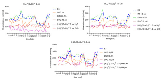 After the application of 3, 1.5, and 0.5 µM of [HL]2+[CuCl4]2− in ethanol, locomotor activity in the light phase stayed on the same level which was lower than the control groups. Moreover, the overall locomotor activity in the dark phase after dissolving [HL]2+[CuCl4]2− in water was lower than in ethanol and lower than in the control group. Studies showed that the acute application of small doses of ethanol influences the level of anxiety-like behavior in Zebrafish [29,30]. In our study, imipramine–metallic ion compounds were also dissolved in ethanol. For this reason, the activity of these solutions could result in either higher dissolving abilities or applied solvent. This may suggest that ethanol as a solvent for this compound enhances the anxiogenic activity of the [HL]2+[CuCl4]2− in a dose-dependent manner, while water intensifies the anxiolytic activity of the tested compounds. The increase in locomotor activity in the dark phase of the experiment by [HL]2+[CuCl4]2− compound is not only dose-dependent, but also solvent-dependent.