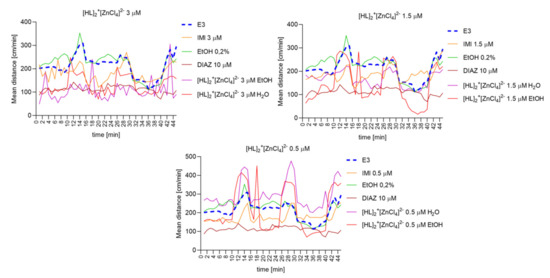 Two-way ANOVA analysis showed significant changes in the average distance/minute (cm) determined by light and dark phases as a response to the treatment (F (1, 1560) = 115.6, p < 0.0001), the phase (light/dark) (F (11, 1560) = 26.19, p < 0.0001), and treatment–phase (light/dark) interaction (F (11, 1560) = 5.545, p < 0.0001). Bonferroni’s post hoc test revealed the significant decrease in the average distance/minute (cm) in the light phase after [HL]2+[ZnCl4]2−/H2O 3 µM (p < 0.01), and [HL]2+[ZnCl4]2−/H2O 3 (p < 0.05)/ [HL]2+[ZnCl4]2−/EtOH 1.5 (p < 0.0001) when compared with the control group, E3 and EtOH 0.2%, respectively. Moreover, in the dark phase, there was also a significant decrease after [HL]2+[ZnCl4]2−/H2O 3 µM (p < 0.0001) and [HL]2+[ZnCl4]2−/EtOH 3 µM (p < 0.0001) when compared to the control groups, E3 and EtOH, respectively. In the light phase, there was a significant increase after [HL]2+[ZnCl4]2−/H2O 1.5 µM (p < 0.05) and [HL]2+[CdCl4]2−/H2O 0.5 µM (p < 0.001) when compared to [HL]2+[CdCl4]2−/EtOH 1.5 µM and [HL]2+[CdCl4]2−/EtOH 0.5 µM, respectively. However, in the dark phase, there was a significant increase after [HL]2+[ZnCl4]2−/H2O 1.5 μM (p < 0.0001), [HL]2+[ZnCl4]2−/H2O 0.5 μM (p < 0.0001), and [HL]2+[ZnCl4]2−/EtOH 0.5 μM (p < 0.0001) and in the light phase after [HL]2+[ZnCl4]2−/H2O 0.5 μM (p < 0.0001) when compared with DIAZ 10 µM in the dark and light phases, respectively. Moreover, there was a significant decrease after [HL]2+[ZnCl4]2−/H2O/ light 0.5 μM when compared to [HL]2+[ZnCl4]2−/H2O/dark 0.5 μM (p < 0.01), and significant decrease after [HL]2+[ZnCl4]2−/EtOH/light 1.5 μM (p < 0.0001) and [HL]2+[ZnCl4]2−/EtOH/light 0.5 μM (p < 0.0001) when compared to [HL]2+[ZnCl4]2−/EtOH/dark 1.5 μM and [HL]2+[ZnCl4]2−/EtOH/dark 0.5 μM, respectively. Moreover, the Bonferroni’s post hoc test revealed a significant increase after [HL]2+[ZnCl4]2−/H2O in the light phase 0.5 μM (p < 0.01), and [HL]2+[ZnCl4]2−/H2O 0.5 μM (p < 0.0001), [HL]2+[ZnCl4]2−/EtOH 0.5 μM (p < 0.0001) in the dark phase when compared to IMI 0.5 μM in the light and IMI 0.5 μM in the dark phase, respectively. However, there was a significant decrease in the dark phase after [HL]2+[ZnCl4]2−/EtOH 3 μM application (p < 0.05) when compared with IMI 3 μM.