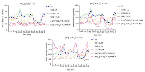 One-way ANOVA analysis (Figure 11C) revealed a significant difference in the spontaneous locomotor activity (average distance/minute (cm)) caused by treatment (F (11, 276) = 8.648, p < 0.0001). Tukey’s post hoc test revealed significant decrease in the average distance/minute (cm) after [HL]2+[CdCl4]2−/H2O 3 µM (p < 0.05) and [HL]2+[CdCl4]2−/EtOH 3 µM (p < 0.01) treatment when compared with the control groups, E3 and EtOH 0.2%, respectively. Moreover, Tukey’s post hoc test showed significant increase in the average distance/minute (cm) after [HL]2+[CdCl4]2−/H2O 0.5 µM when compared with IMI 0.5 µM (p < 0.05), and DIAZ 10 µM (p < 0.001). When the treatment with [HL]2+[CdCl4]2−/EtOH 0.5 µM was applied the average distance/minute (cm) was significantly increased when compared with IMI 0.5 µM (p < 0.001) and DIAZ 10 µM (p < 0.0001). Two-way ANOVA analysis revealed no significant difference in spontaneous locomotor activity (average distance/minute (cm)) in a treatment (F (1, 23) = 1.811, p = 0.1915) and solvent–treatment interaction (F (3, 69) = 1.602, p = 0.1969), and significant difference in the spontaneous locomotor activity after solvent influence (F (3, 69) = 28.53, p < 0.0001). Bonferroni’s post hoc test revealed significant decrease in the spontaneous locomotor activity after [HL]2+[CdCl4]2−/H2O 3 µM (p < 0.01) and [HL]2+[CdCl4]2−/EtOH 3 µM (p < 0.001) treatment when compared to the control groups, E3 and EtOH 0.2%, respectively.