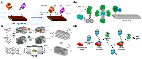 The interaction between neighbor enzymes in the enzyme-catalyzed reaction can also be affected by designed DNA. For example, Mukherjee et al. introduced a method of programming the function of streptokinase to control the spatial and temporal activities of enzymes (Figure 1d) [37]. The DNA-linked protease inhibitor was designed like a switch to regulate fiber activity, produced by a streptokinase (SK) and plasminogen (PG) combination. This SK-PG conjugation finally turned out to be effective in a complex whole blood-clot environment. DNA can also be used as a carrier to form a more complex enzyme nanofactory by embedding enzymes on a DNA origami nanoplatform [49]. In this system, DNA is a completely recyclable component which can be specifically modified to control the enzyme labeling. This mechanism is also expected to be applied in simple single-protein control and even multi-proteins binding regulation.