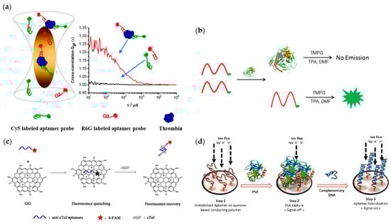 The detection of the binding between aptamers and proteins is usually interrogated by fluorescence and electrochemical techniques. For example, the detection principle was based on the turn-off fluorescence when the free prostate-specific antigen (PSA) aptamer, modified by 6-carboxyfluorescein (6-FAM), bound with PSA. This method provided a quick prostate cancer test at relatively lower cost. Otherwise, researchers have put forward some designs to obtain clear detection signals. For example, Xing and colleagues raised a method in which a fluorescence cross-correlation signal is visible only when the aptamer probes–protein sandwiching structure formed (Figure 2a) [54], despite the fact that when using electrochemical techniques, aptamers are usually combined with metal or inorganic electrodes. For example, Lee and his colleagues found a method for quick prostate-cancer tests (Figure 2b) [55]. In 2018, Li and colleagues proposed an aptasensor using fluorescence detection (Figure 2c) [56]. This sensor based on graphene oxide was developed for the highly sensitive and selective determination of human cardiac troponin I (cTnI).