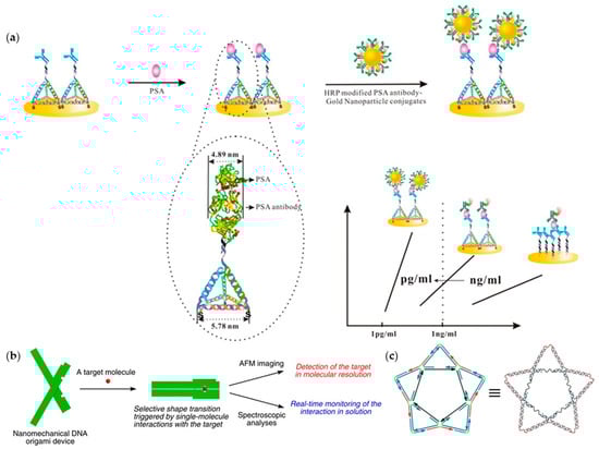 Protein detection based on DNA nanostructures. (a) DNA frame to control the assembly of antibodies (adapted with permission from [68]. Copyright 2014, American Chemical Society); (b) a functional “DNA origami plier” used as a protein test platform (adapted with permission from [70]. Copyright 2011, Springer Nature); (c) a pentagram-shaped DNA scaffold for DENV tests (Adapted with permission from [71]. Copyright 2019, Springer Nature).